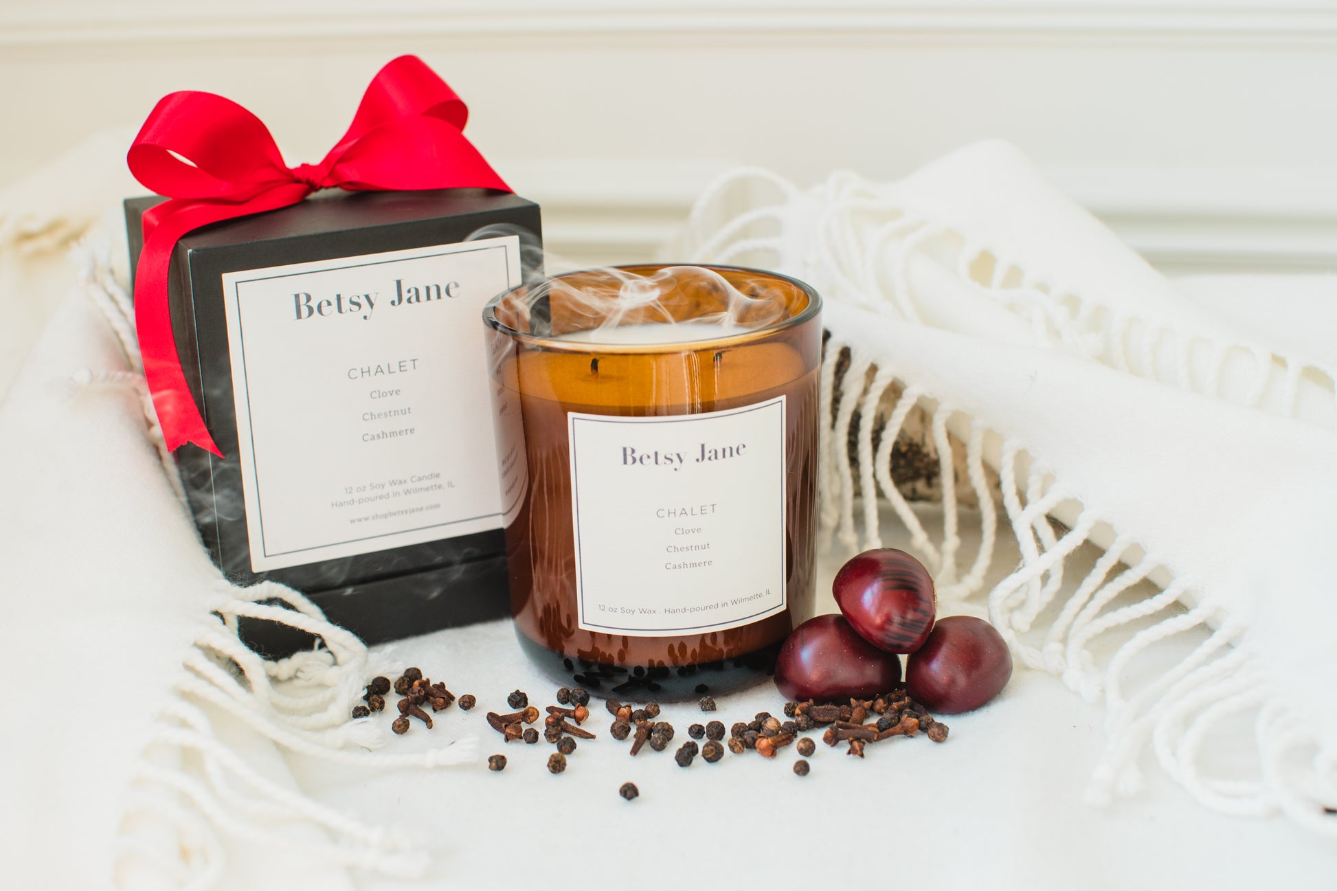 It is a 12 oz double-wick soy candle in a translucent amber glass vessel and a luxury gift box.