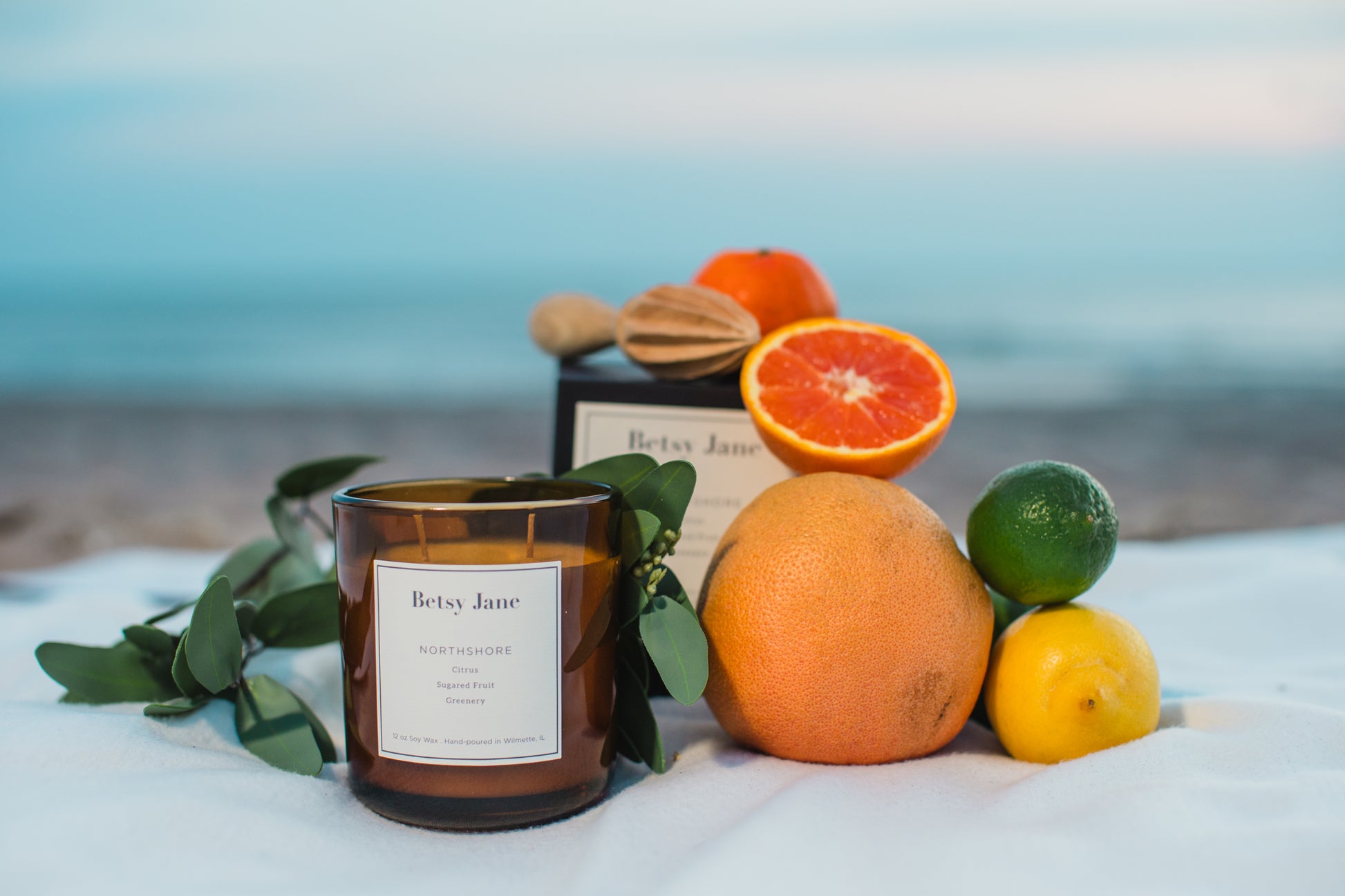 Inspired by the beauty of home, which for Katy is located on the north shore community along Lake Michigan, outside of Chicago. This bright and energizing aroma smells like zesty citrus, sugared fruit and greenery. It is perfect for the kitchen, entryway, bathroom, or gym. It is a 12 oz double-wick soy candle in a translucent amber glass vessel and a luxury gift box.