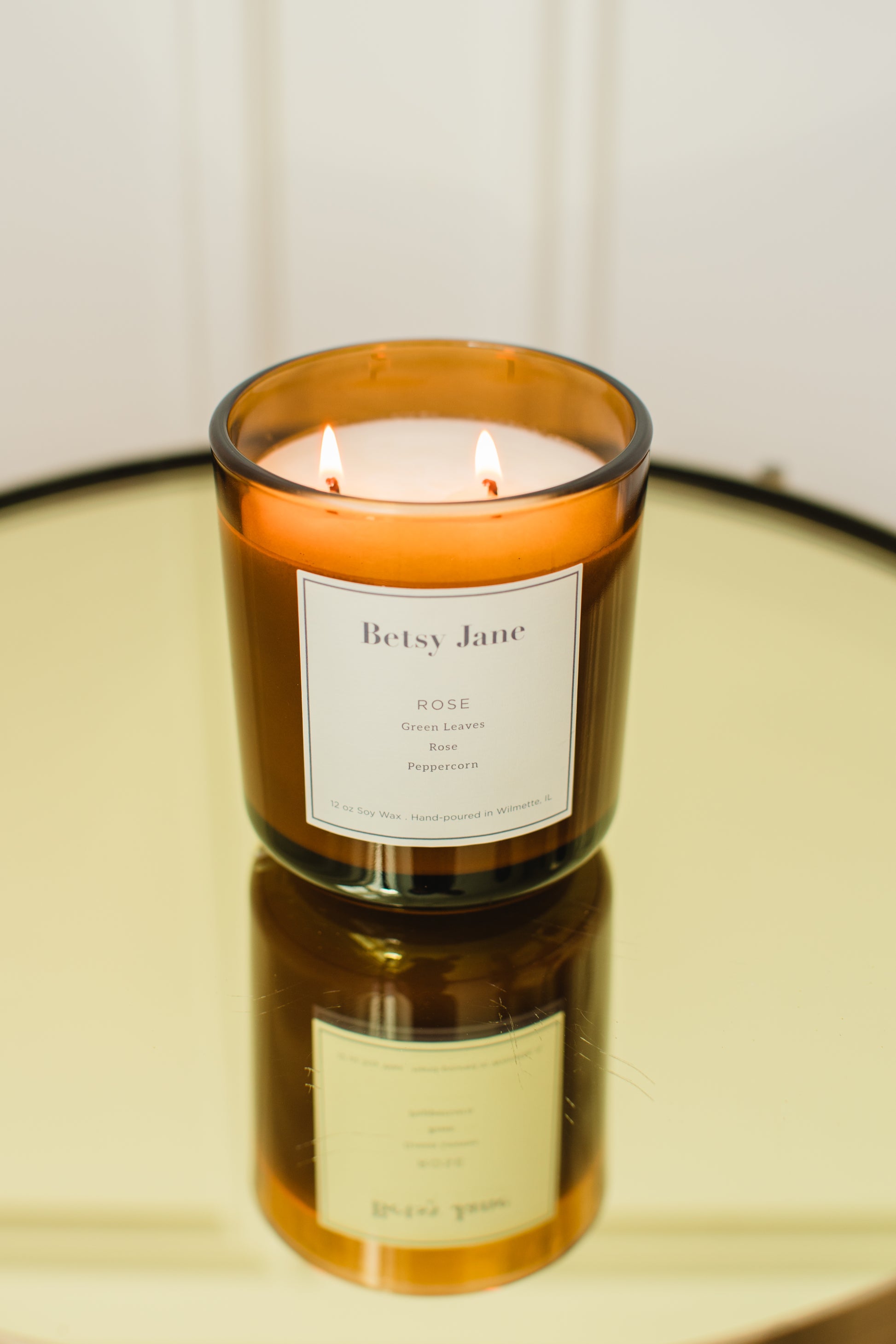 Inspired by a Mother's love, Rose features a modern twist on a classic floral aroma. It smells like green leaves, rose, and peppercorn. It is great for the bathroom, kitchen, or entryway to welcome friends and family into a soothing environment. It is a 12-oz double-wick soy candle in a translucent amber glass vessel and a luxury gift box.